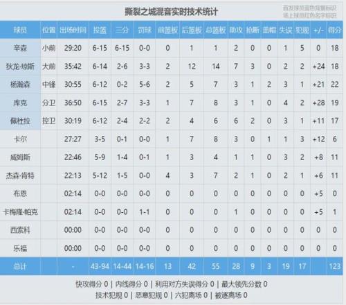 三节打完,混音队91-81领先10分。杨瀚森前三节打了23分15秒,投篮11中5,三分2中0,罚球5中4,得到18分5篮板3助攻2盖帽。第四节分差越拉越大,比赛节奏很快。比赛收官阶段,杨瀚森又贡献一记抢断和一记勾手命中。