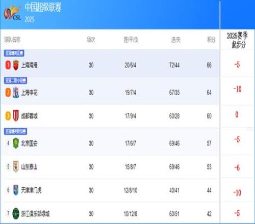 比如去年海港拿66分,扣5分还剩61分。申花64分,扣10分后仅剩54分。成都蓉城依然是60分。北京国安57分扣5分后剩52分。山东泰山扣6分后还有47分。扣分后从高到低的积分排名是:海港61分,成都蓉城60分,上海申花54分,北京国安52分,山东泰山47分。